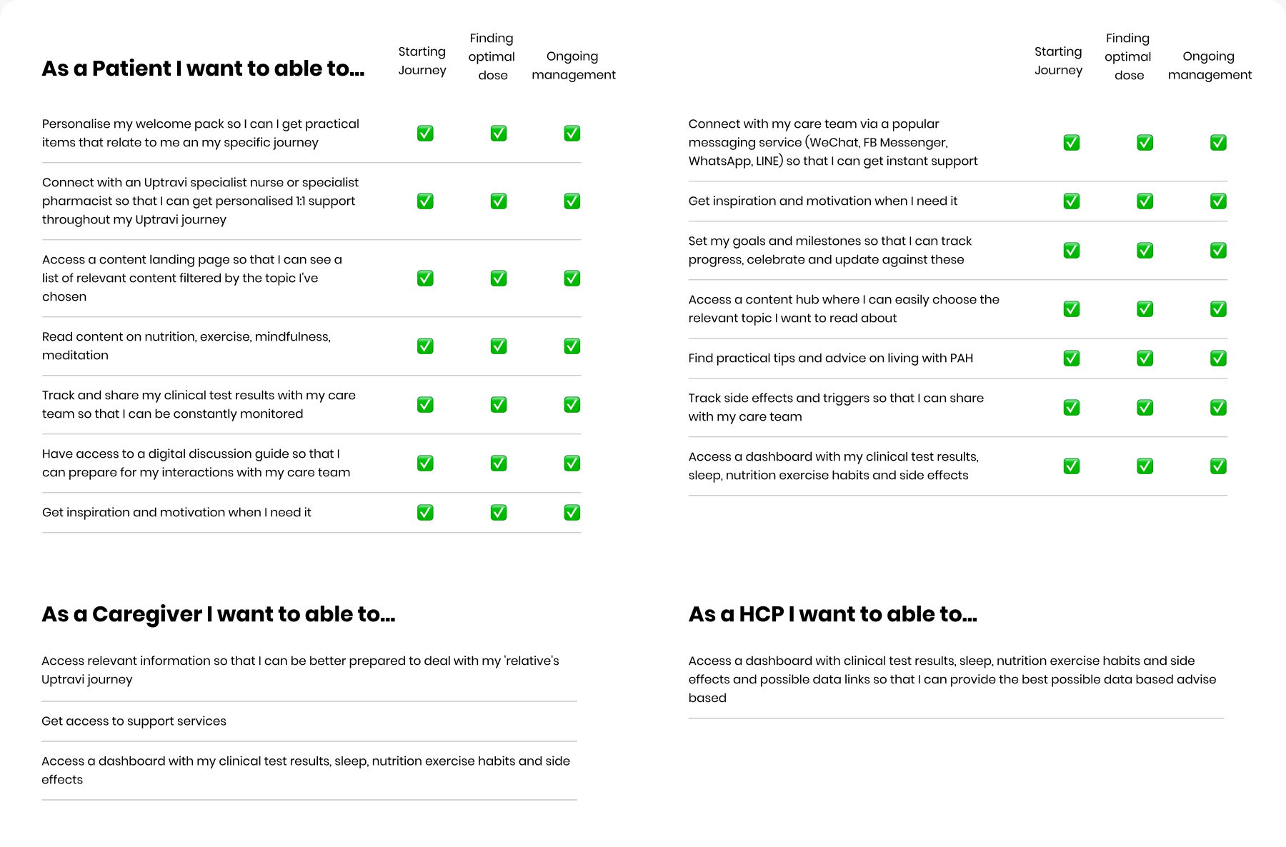 I led UX/UI design for a proof-of-concept health app designed to support patients taking Uptravi, a medication used to treat pulmonary arterial hypertension. My role included research, persona creation, UX definition, wireframing, and collaboration with clinical and pharmaceutical stakeholders to ensure medical accuracy and usability.